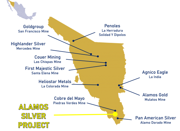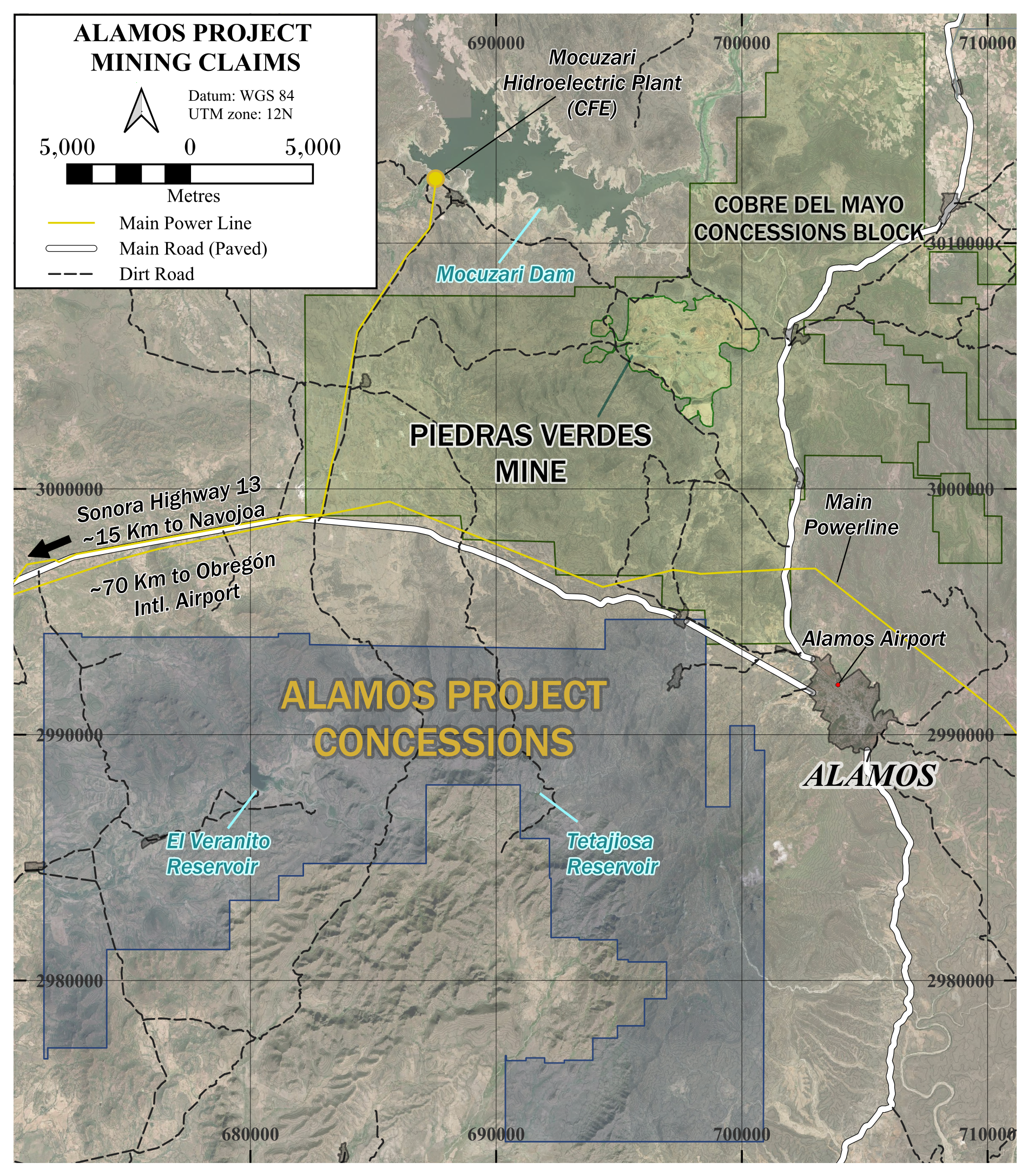 The 100% owned Alamos Silver Project controlling over 37,000 hectares is located in Sonora, Mexico and presents a unique opportunity in that it is permitted for production with an initial inferred resource estimate of 55 million ounces AgEq grading 320 g/t AgEq (see Minaurum news release dated January 28, 2026 and Resource section above). Cobre del Mayo’s Piedras Verdes porphyry copper mine lies about 16 km to the NNE of the central part of the Alamos district, along the projection of the main fault trend.