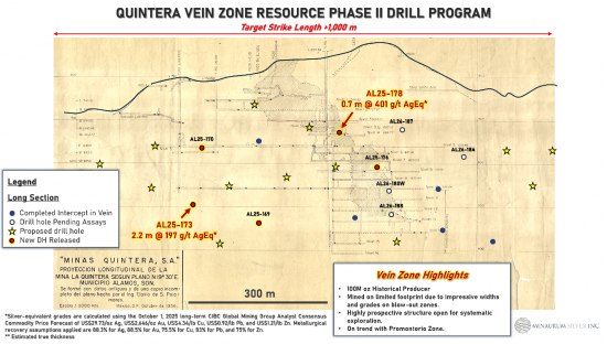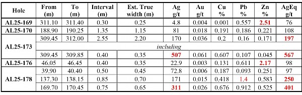 0.50 m of 524 g/t silver equivalent (“AgEq”) in hole AL25-172, 0.30 m of 1,032 g/t AgEq in hole AL25-174 and 1.40 m of 290 g/t AgEq in hole AL25-175. At Travesía-Quintera, step-out drilling returned 2.55 m of 197 g/t AgEq, including 0.40 m grading 567 g/t AgEq in hole AL25-173 (see Table 1).
