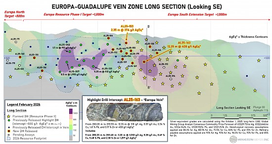 The defined resource of the Europa vein zone occupies about 1 km of its surface-traced 3-km strike length. Recent assay results extend high-grade mineralization along strike, particularly the 1 km extension to the south at Europa. Hole AL25-163 intersected a significant wide interval of 12.35 m zone averaging 408 g/t AgEq, including 3.20 m of 1,277 g/t AgEq (1,032 g/t Ag, 0.278 g/t Au, 0.692% Cu, 5.477% Pb, 2.379% Zn). Hole AL25-154 returned 1.05 m of 231 g/t AgEq, including 0.25 m of 700 g/t AgEq (355 g/t Ag, 1.86 g/t Au, 1.45% Cu, 0.77% Pb, 1.89% Zn) (See Table 1, Figures 2 and 3).