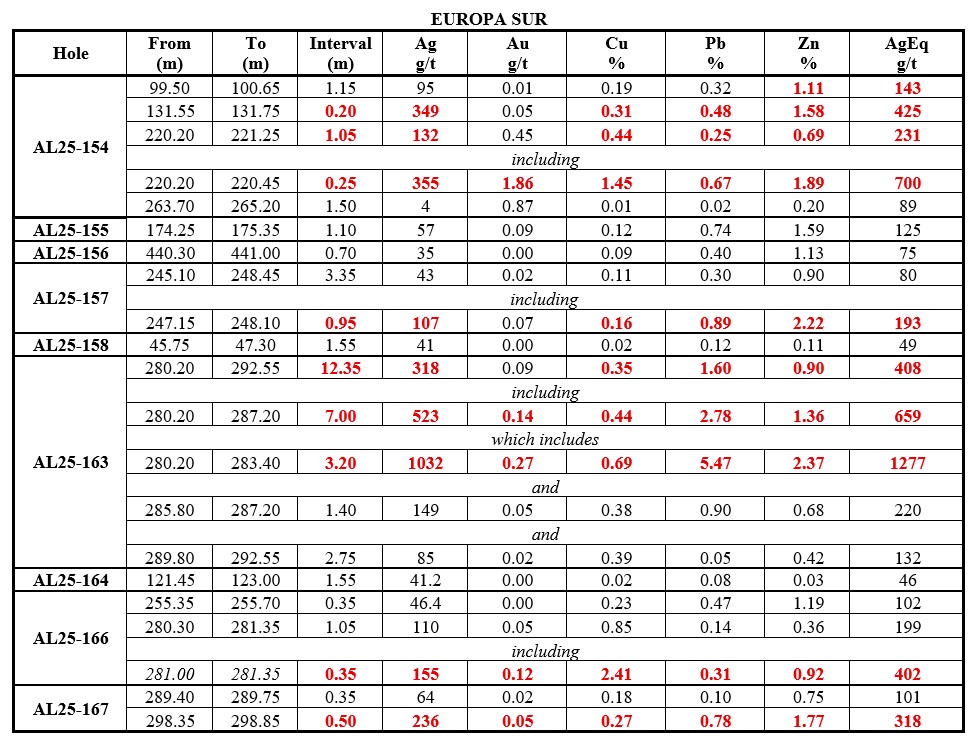 The defined resource of the Europa vein zone occupies about 1 km of its surface-traced 3-km strike length. Recent assay results extend high-grade mineralization along strike, particularly the 1 km extension to the south at Europa. Hole AL25-163 intersected a significant wide interval of 12.35 m zone averaging 408 g/t AgEq, including 3.20 m of 1,277 g/t AgEq (1,032 g/t Ag, 0.278 g/t Au, 0.692% Cu, 5.477% Pb, 2.379% Zn). Hole AL25-154 returned 1.05 m of 231 g/t AgEq, including 0.25 m of 700 g/t AgEq (355 g/t Ag, 1.86 g/t Au, 1.45% Cu, 0.77% Pb, 1.89% Zn) (See Table 1, Figures 2 and 3).