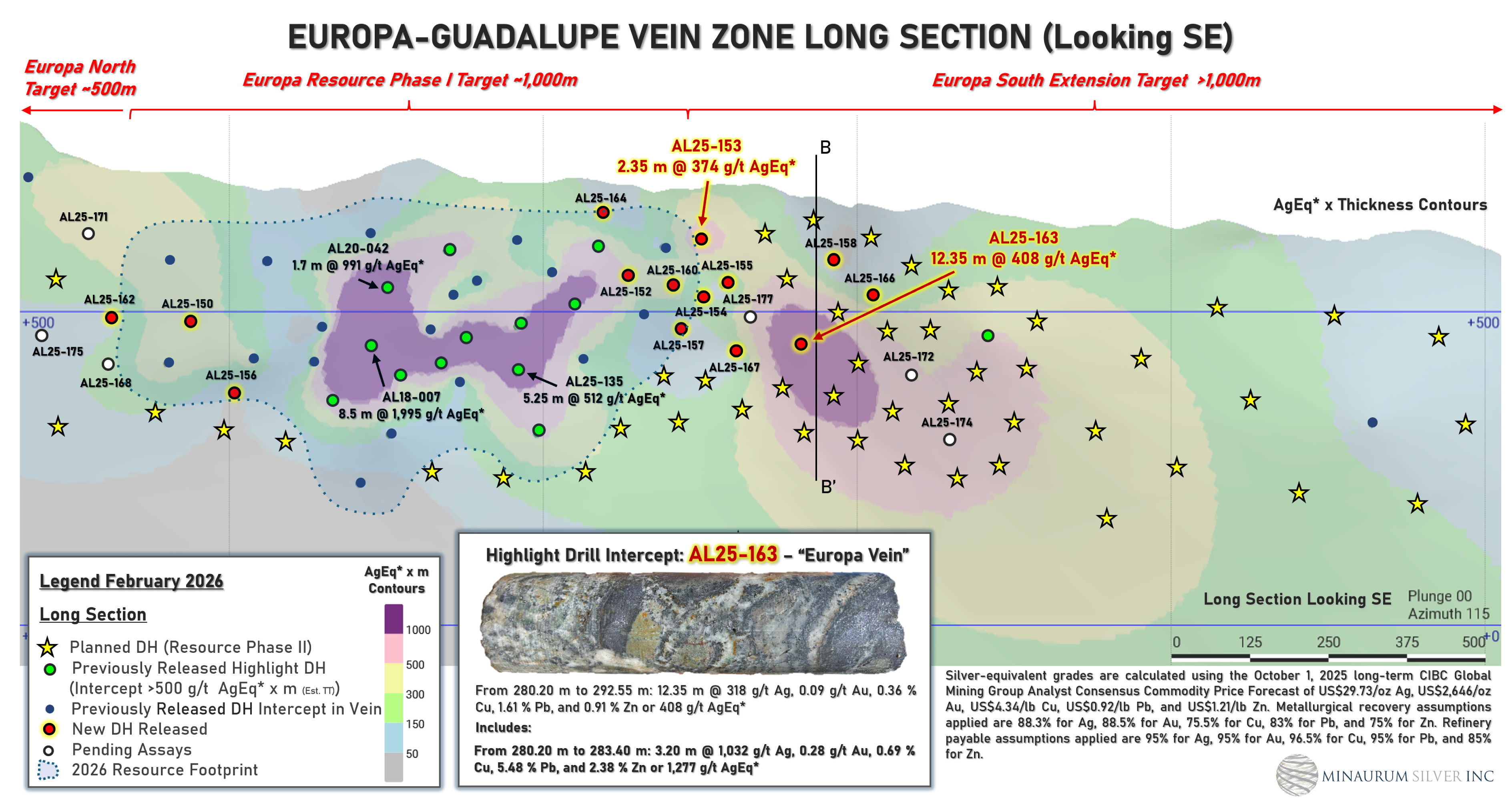 “Hole AL25-163 confirms the continuity of high-grade silver mineralization well beyond the current inferred resource in the Europa Vein Zone,” said Darrell Rader, President and CEO of Minaurum Silver. “Stepping out 250 metres and intersecting strong grades and widths demonstrates the scale of the system. With the mineralization remaining open both down dip and along strike, these results support our strategy to significantly expand the Alamos resource with continued drilling.”