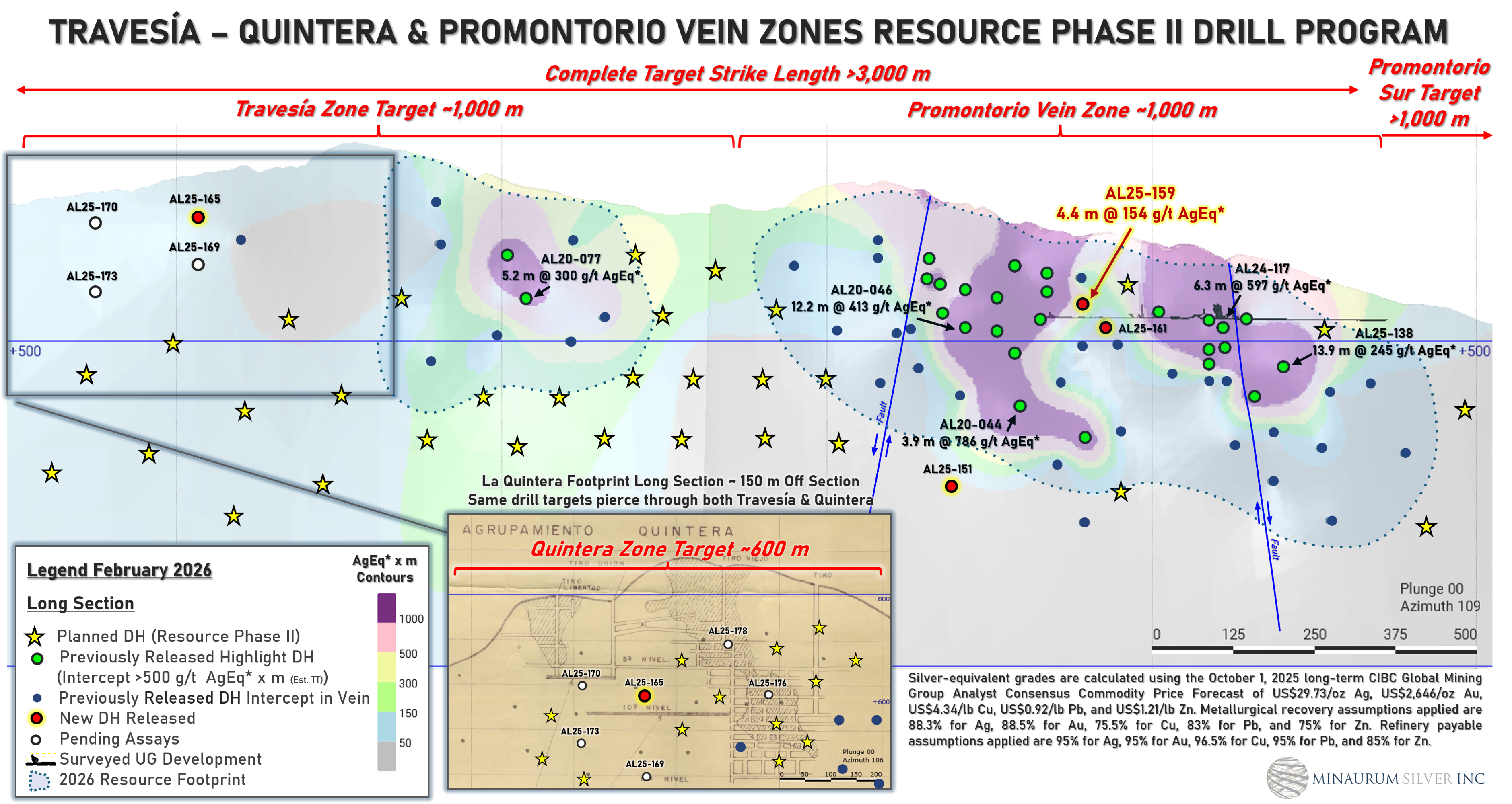Weight-averaged silver-equivalent grades are based on October 1, 2025 Long-term CIBC Global Mining Group Analyst Consensus Commodity Price Forecast: Ag $29.73/tr oz, Au $2,646/tr oz, Cu $4.34/lb, Pb $0.92/lb, Zn $1.21/lb. Metallurgical recovery assumptions applied are 88.3% for Ag, 88.5% for Au, 75.5% for Cu, 83% for Pb, and 75% for Zn. Refinery payable assumptions applied are 95% for Ag, 95% for Au, 96.5% for Cu, 95% for Pb, and 85% for Zn.