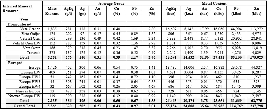 Initial Inferred Resource Estimate: 55 Moz AgEq grading 320 g/t AgEq