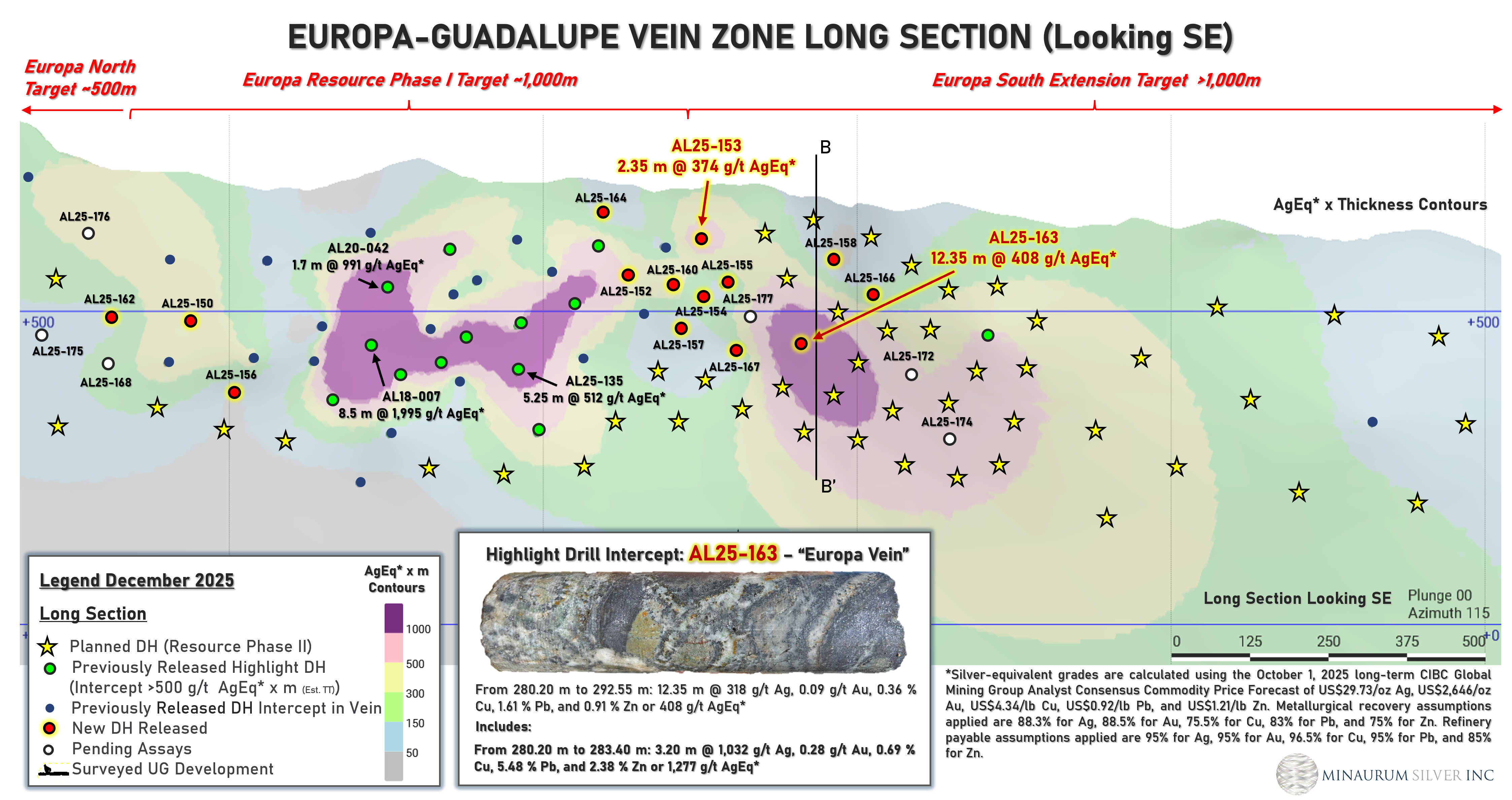 Minaurum extended the Europa vein zone by 250 meters in step-out hole that intersected a significant wide interval of 12.35 m zone averaging 408 g/t AgEq, including 3.20 m of 1,277 g/t AgEq (1,032 g/t Ag, 0.278 g/t Au, 0.692% Cu, 5.477% Pb, 2.379% Zn). Hole AL25-154 returned 1.05 m of 231 g/t AgEq, including 0.25 m of 700 g/t AgEq (355 g/t Ag, 1.86 g/t Au, 1.45% Cu, 0.77% Pb, 1.89% Zn). These holes confirms the continuity of high-grade silver mineralization well beyond the current inferred resource in the Europa Vein Zone.