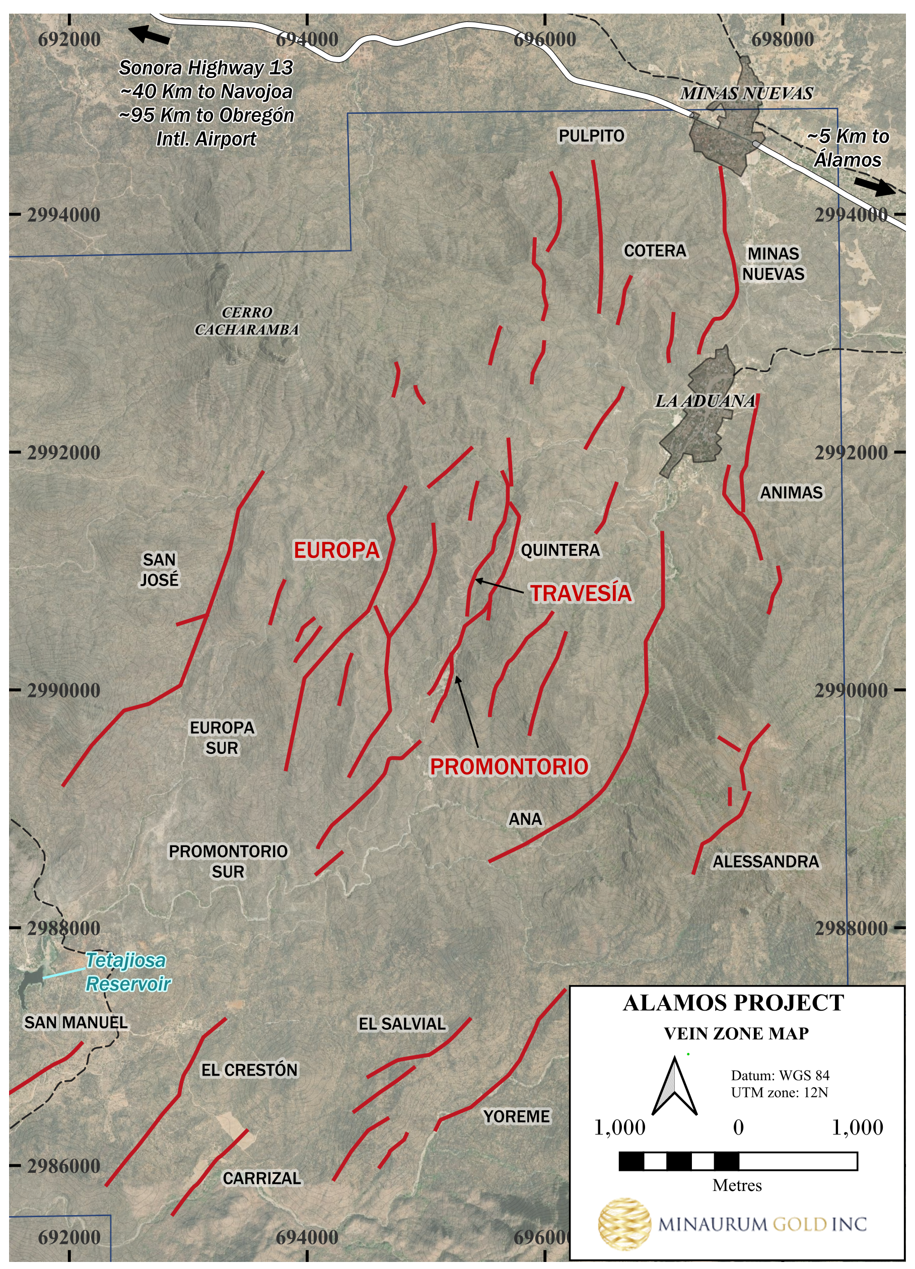 Minaurum geologists have covered more than 75 sq km with detailed geological mapping and the geochemical database has more than 1500 rock samples. Company geologists have identified 26 vein zones in the Alamos district; surface mapping, sampling, and vein zone identification are on-going.