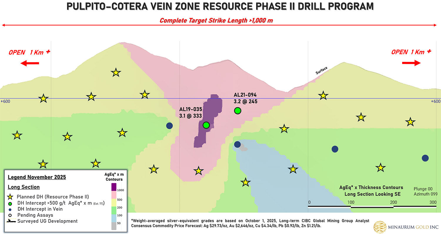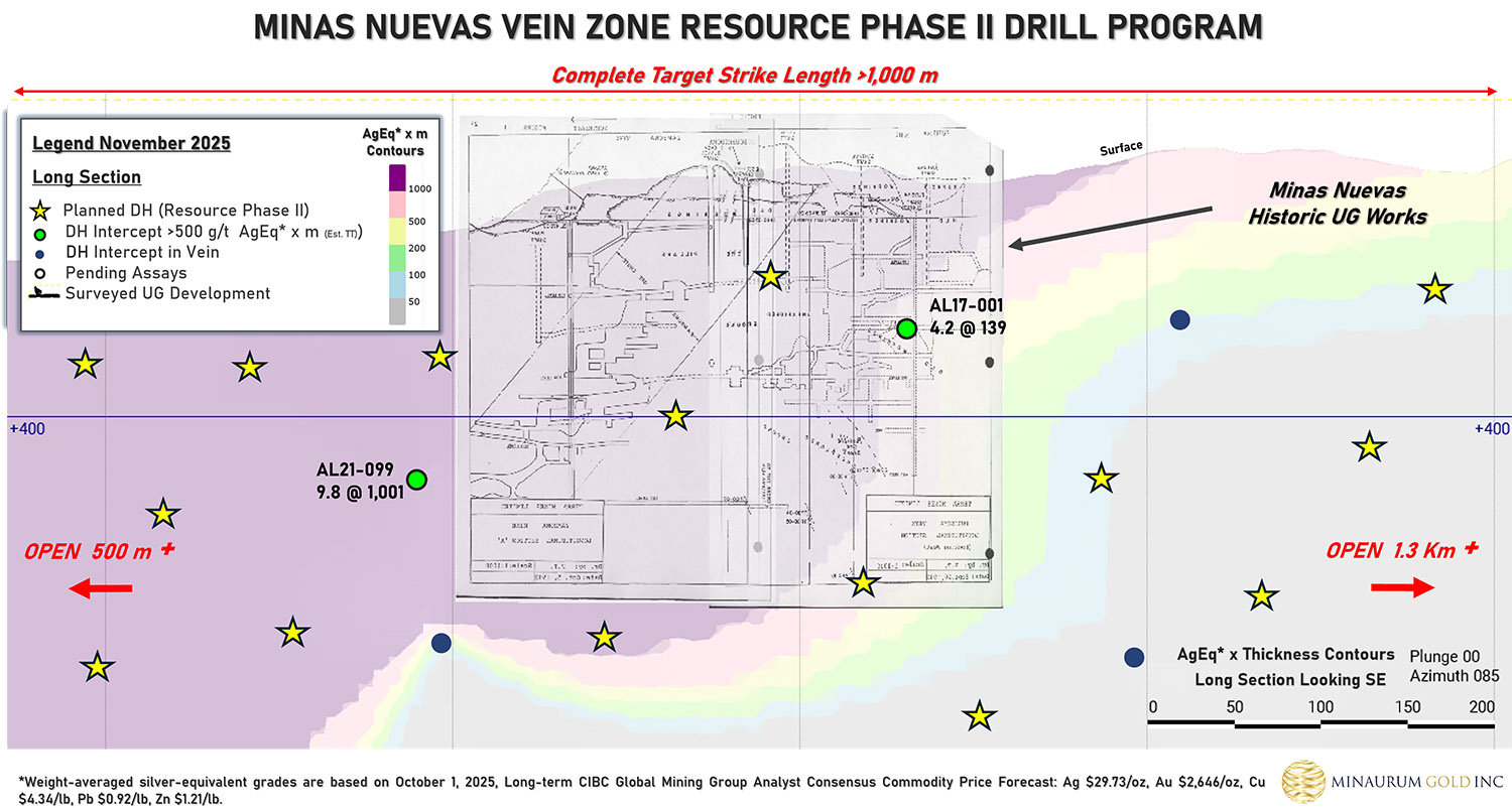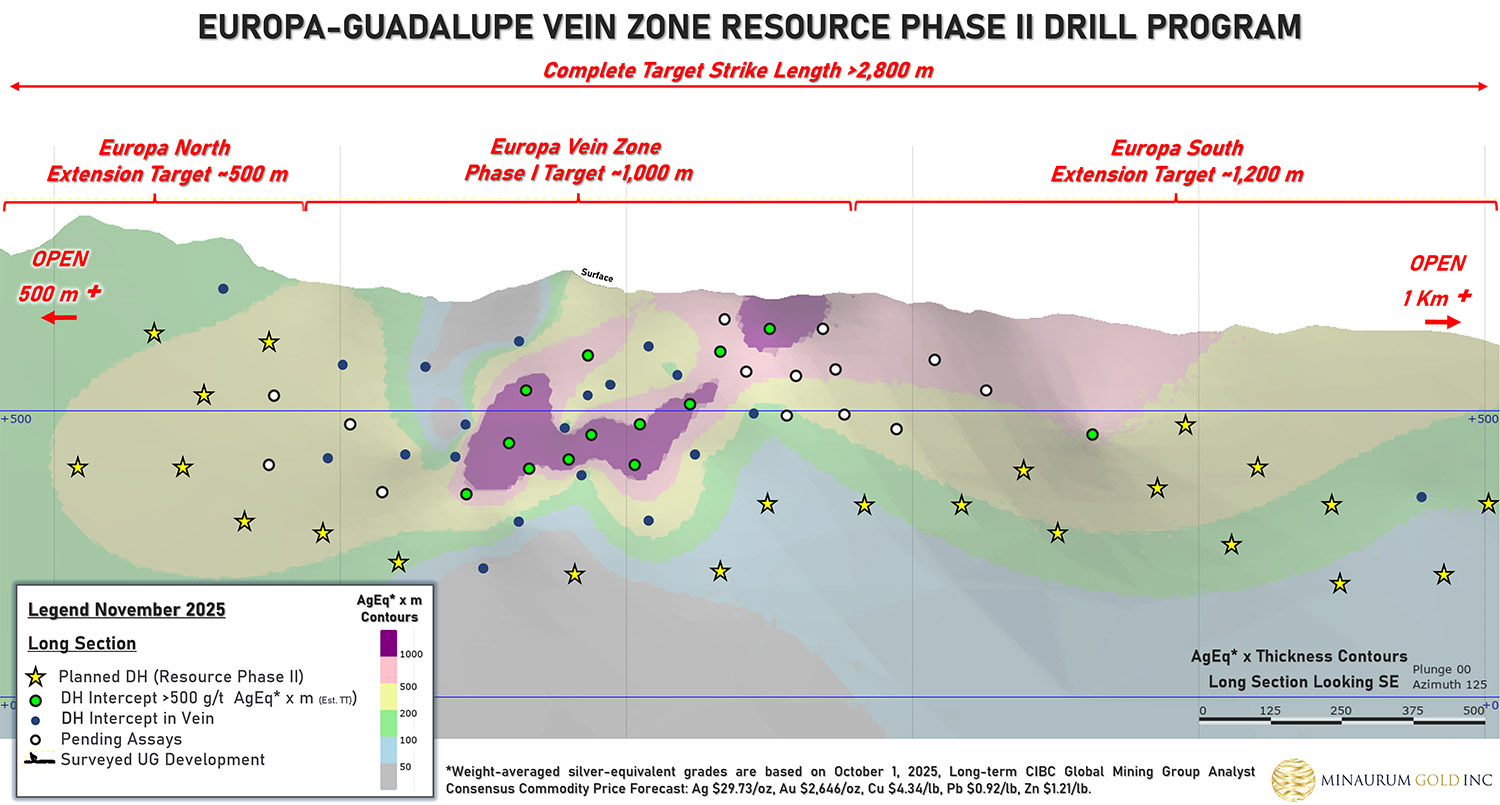 Minaurum owns Alamos 100%, controlling over 37,000 hectares with over 50,000 meters of diamond core drilling completed with an average silver grade of 221 g/t silver (Ag), copper grade is 0.34%, lead grade is 0.99%, zinc grade is 2.06% and 354 g/t silver equivalent (AgEq) with an average width of 4.80 m. Note: 1) Silver-equivalent grades are based on October 1, 2025, Long-term CIBC Global Mining Group Analyst Consensus Commodity Price Forecast: Ag $29.73/oz, Au $2,646/oz, Cu $4.34/lb, Pb $0.92/lb, Zn $1.21/lb. 2) Based on 45,711 meters and 116 diamond drill core hole intersections from 2017-2024 on Promontorio, Europa-Guadalupe, San Jose, Minas Nuevas, Cotera-Pulpito and Alessandra vein zones 3) Based on vein intercepts above 150 g/t AgEq* on a minimum 1-meter interval.