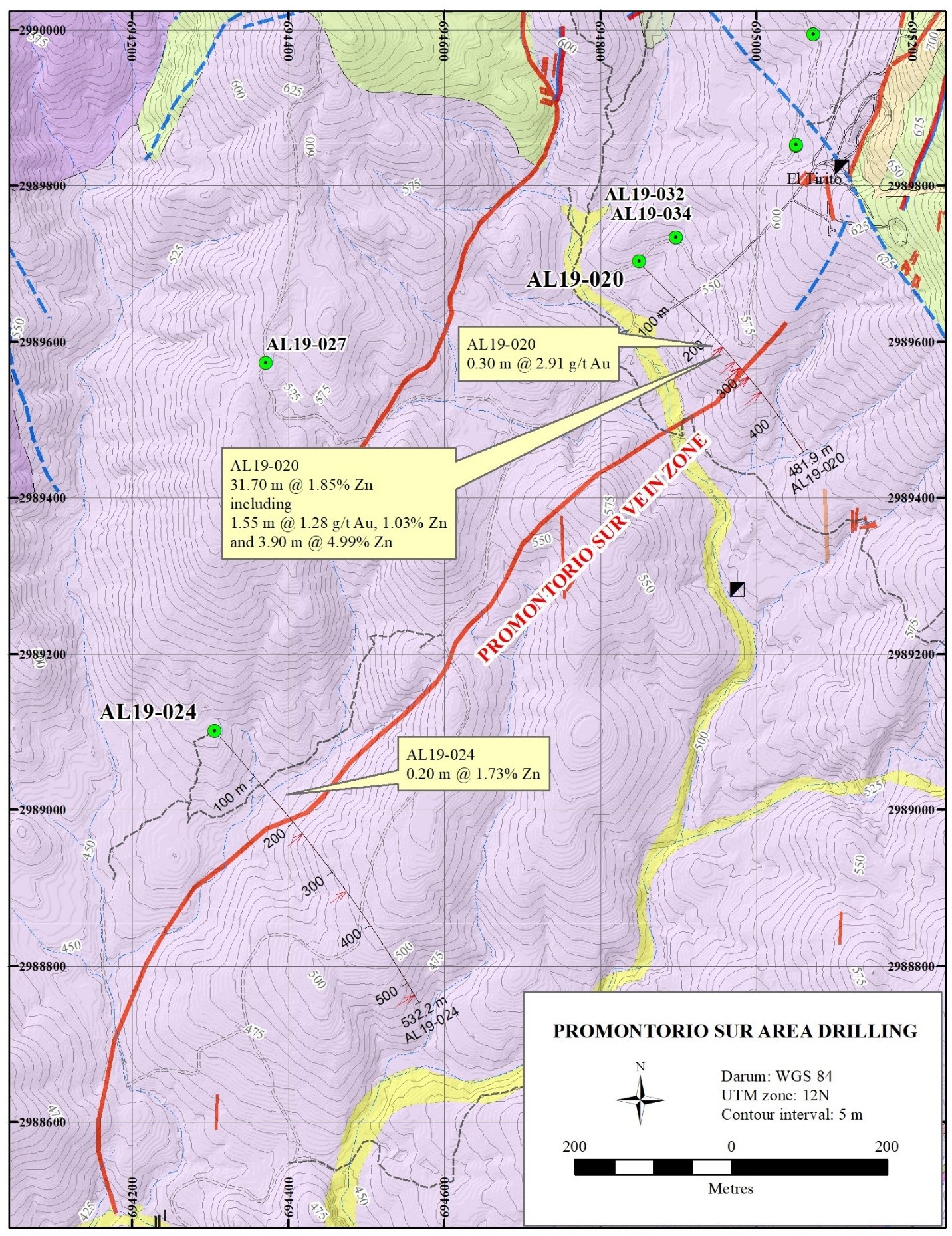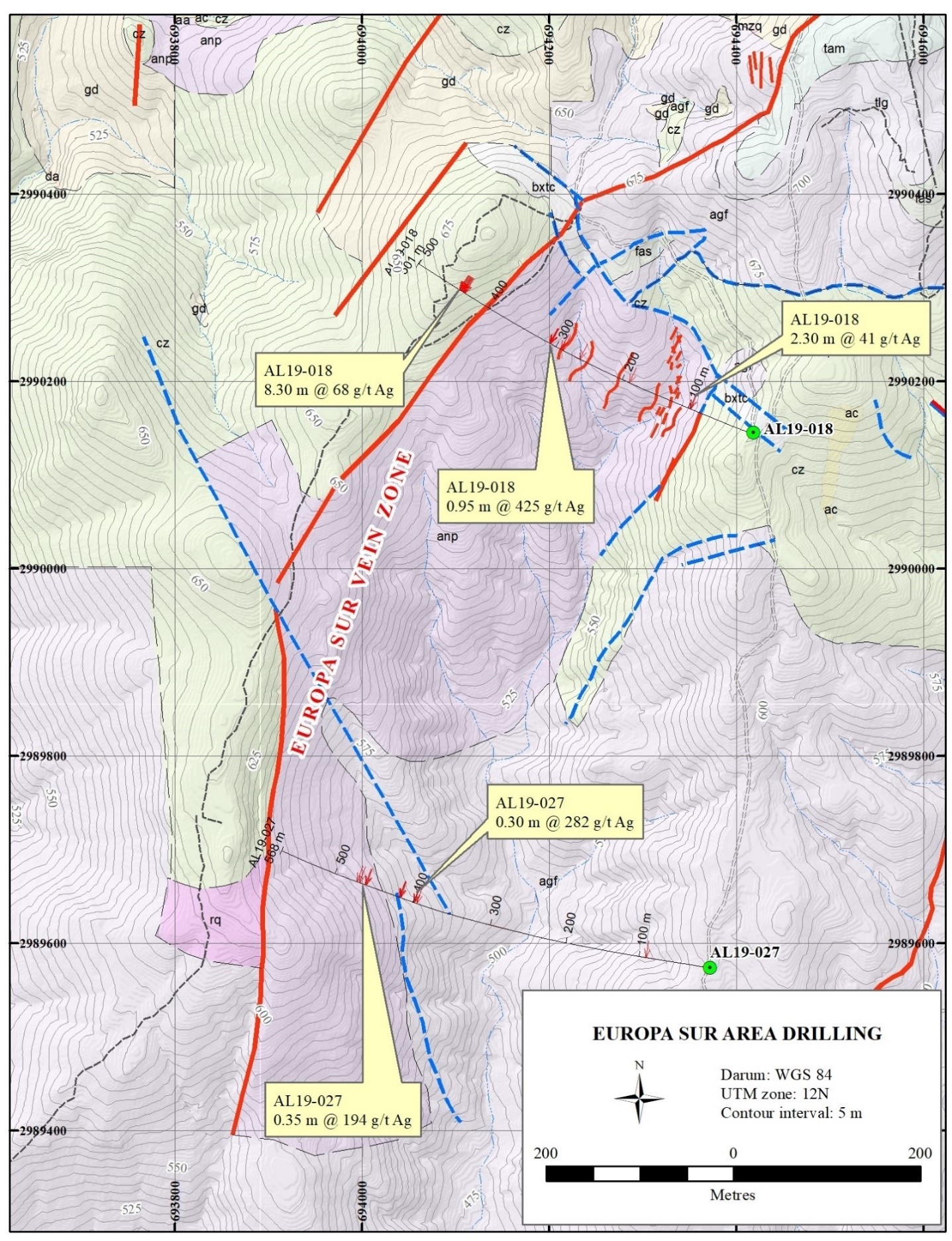 | Europa Sur | 1000 | 0.95 m @ 425 g/t Ag, 0.32% Cu, 3.17% Pb 1.31% Zn, including 0.50-m @ 719 g/t Ag, 172 ppb Au, 0.57% Cu, 5.91% Pb, and 2.37% Zn (AL19-018) |