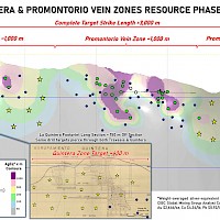 Drill hole spacing within the modeled vein domains averages approximately 80 metres, with locally tighter spacing in higher-grade portions of the Promontorio vein zone. Most of the resource occurs in unmined zones, with partially mined-out areas in the Promontorio vein zone. Interpreted void volumes associated with historical mining have been deducted from the Resource Estimate based on interpretations of historical longitudinal sections, mine maps, and drill hole data. The resource remains open in along strike and down dip on both the Promontorio and Europa vein zones. Multiple other veins in the district have high-grade intercepts that await potential resource definition.