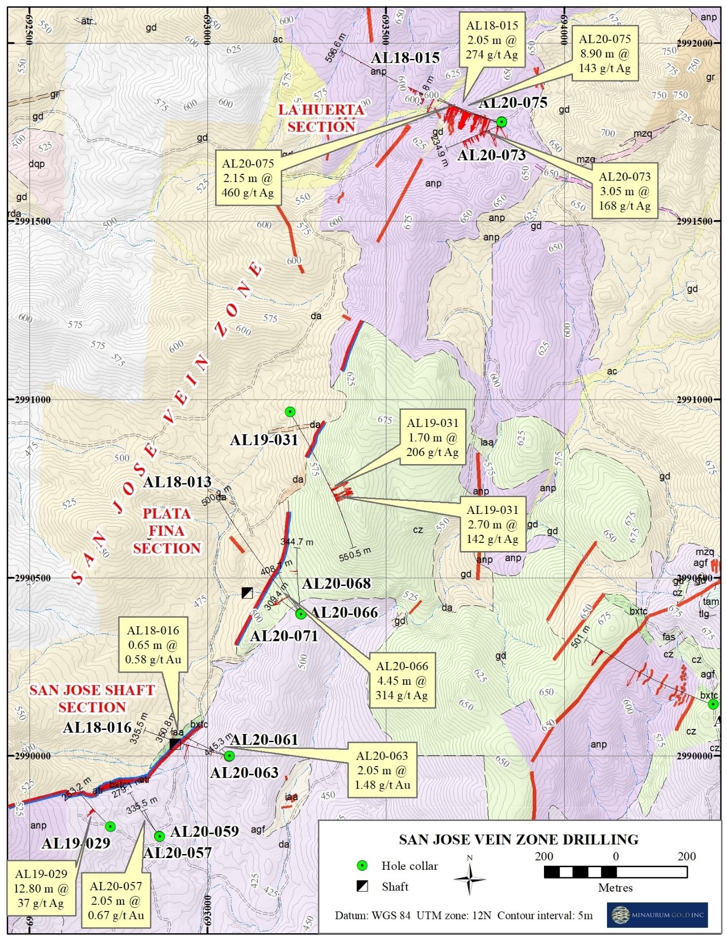 Minaurum acquired historical data including mine maps, sections and assay results of 40 holes (6,099 m) drilled in multiple surface and underground exploration campaigns that occurred from the 1960s through the early 1980s. The exploration programs were focused on the historic Promontorio and Minas Nuevas underground mines that closed in 1898 and 1912, respectively. The majority of these historical holes cut broad widths of high-grade silver, the best include: Hole U-3 that cut 4.6 m grading 2,838 g/t silver and Hole U-5 that cut 11.3 m of 785 g/t silver. The drill results indicate that the historically mined deposits included multiple veins that continue both down plunge and along-strike. At Promontorio, drill holes intersected mineralization over 50 m below the historic mining level and indicate an aggregate 735 m strike length of mineralization. (please see News Release February 6, 2020).